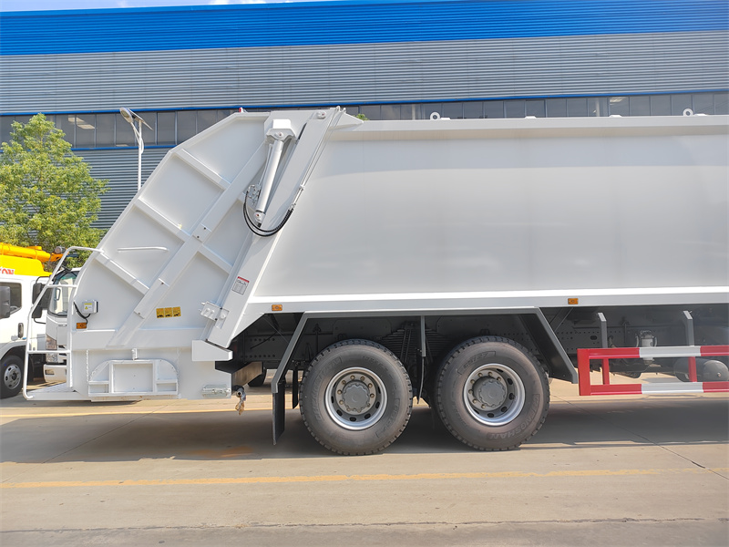 18000(2 axles)这22立方米豪沃卡车垃圾压缩车 这是一款专为城市环卫设计的高效垃圾清运车。它搭载强劲的潍柴340马力发动机和中国重汽10速变速箱,动力充沛。其车体采用22立方米弧形碳钢罐体,经特殊防腐防锈处理,坚固耐用,满足大规模垃圾收集运输的需求。该车集成先进的压缩和装卸系统,可快速装卸垃圾,显著提升单次运输能力。此外,它还配备CAN总线智能电子控制系统、手动液压操作系统,支持多工位操作,并具备紧急制动、电气联锁等安全功能,确保安全高效运行。它是现代城市垃圾收集运输的理想之选。