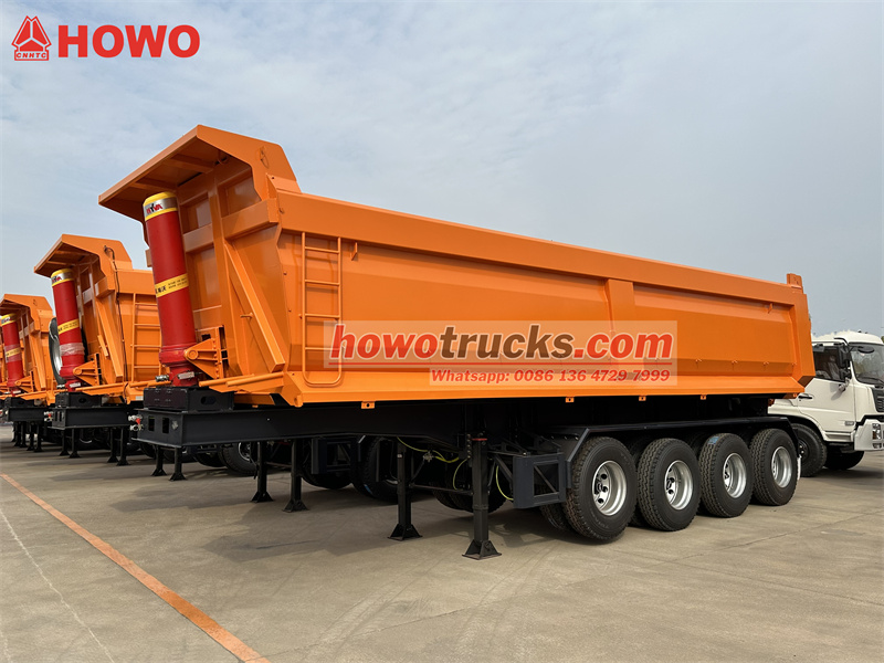 14000*4The 新的 4 轴 6000CBM 自卸车 车身拖车 采用Q370R材料制成,设计压力为1.61兆帕,板厚为12-16毫米。配备HYVA液压系统和压力表,确保运行安全。BPW桥梁、JOST牵引销和JOST支腿等部件满足了各种环境和道路条件下的运输需求。