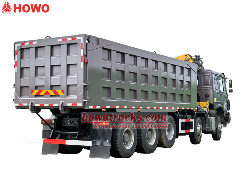 TheHowo矿用自卸车带起重机,建造于 Howo重型10x4驱动底盘,配备 WP12S400E201柴油发动机和 HW19710 10速变速箱。它动力性能强劲,能够适应复杂的工作条件。它配备有 CS型关节起重机 最大起重能力为 8 吨。自卸式货箱采用钩臂式可拆卸设计,材质为Q235碳钢,兼具高承载能力和耐久性。翻斗结构支持货箱快速装卸,大大提高了运输灵活性,适用于建筑垃圾、沙石等散装物料的中短途运输场景。