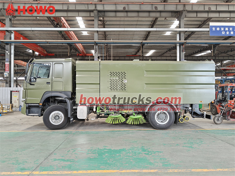 HOWO 12立方米道路清扫车是在HOWO HW76驾驶室底盘的基础上改装而成,轴距4600毫米,配备潍柴WP10.300E22发动机、中国重汽HW19710变速箱、4000升碳钢水箱、8000升不锈钢内外碳钢垃圾箱以及东风康明斯B14033辅助发动机。该车配备四个扫地刷和一个吸盘、一台维业鼓风机、一台德国PINFL PF36高压柱塞泵(1150转/分钟)以及一台杭州威龙60/90低压水泵(60立方米/分钟)。³(/h)。驾驶室前方设有多个冲洗喷嘴,扫刷前方设有一个喷水喷嘴。高压水冲洗宽度为2.5米,扫刷清扫宽度为3.5米,最大清扫能力为60,000平方米。³清扫速度为3-20公里/小时。车辆由驾驶室内的电子控制箱和吸盘上的操作控制箱控制。