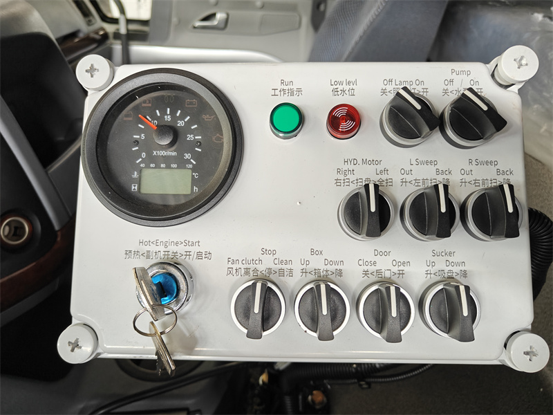 智能电子控制系统在驾驶室内部和吸盘附近集成了双操作箱,可实现刷子升降、水箱倾倒、风机启停等功能的一键控制,确保操作便捷高效。该车采用模块化一体化设计,将动力系统、清扫系统、水系统和智能控制系统整合在一起,实现了高效、节能、环保的作业。