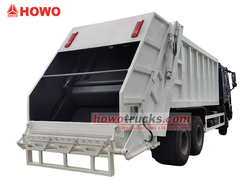 4×4, 6×6, RHD drive is optionalHOWO 20立方米后装式垃圾车是一款基于HOWO重型卡车底盘打造的大型专业环卫车辆,集自动化收集、压缩和转运功能于一体。它不仅是垃圾运输工具,其核心技术在于“压缩”——利用压力高达18兆帕的液压系统,强力压缩容器内的松散生活垃圾。这一过程将有效装载量提升至20立方米,显著提高了单次运输效率。该车采用全密封设计,压缩过程中产生的废水被彻底收集到专用污水箱中。这从根本上消除了传统垃圾车常见的“泄漏和溢出”问题,为城市垃圾收集和运输中的二次污染问题提供了一种有效的解决方案。