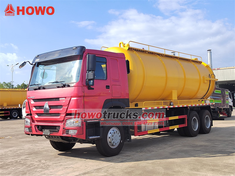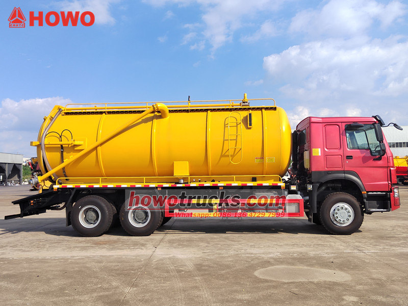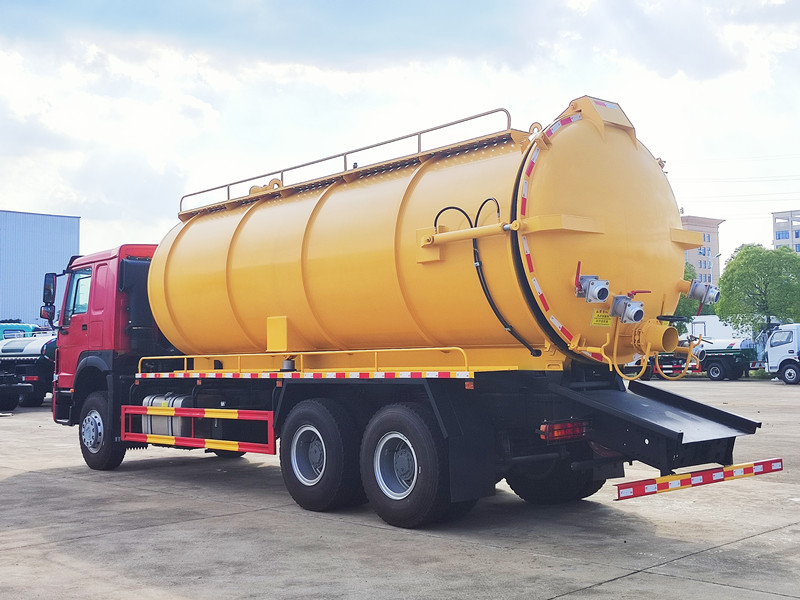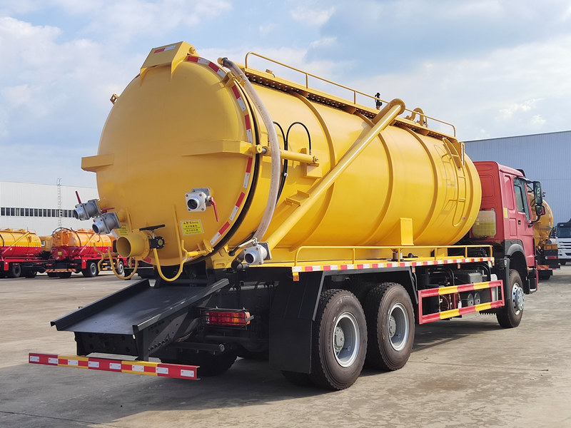 这种做法的主要优势在于: HOWO重型下水道清洁器 该设备采用20立方米碳钢罐,配备意大利Jurop真空泵,可实现高达93%的极限真空度,并带有降噪系统。罐体设有液位报警器和防溢阀,形成双重安全机制。通过液压升降系统,可实现多种卸料模式。DN100球阀和10米长的吸水软管确保运行顺畅,侧面的工具箱和防护网构成完整的作业模块,完全满足市政环卫部门大规模垃圾运输的严格要求。