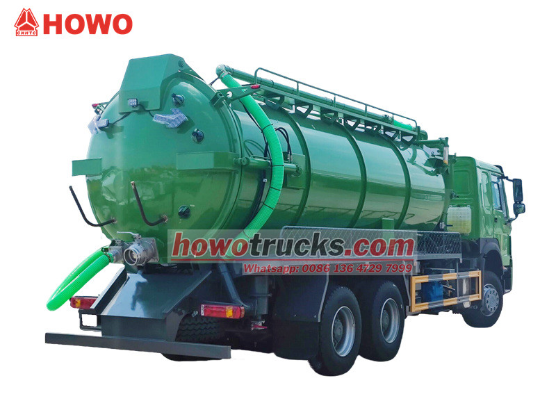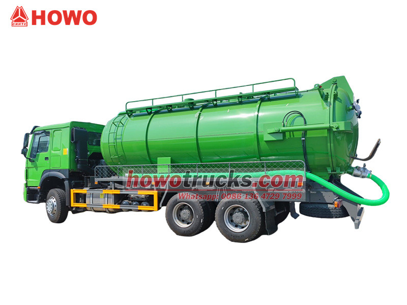 Jurop pump, 4×4, 6×6, RHD drive is optional中国重汽豪沃(SINOTRUK HOWO)下水道真空吸污车是一款基于豪沃6x4重型底盘打造的专业环卫车辆,采用真空负压原理运行。它主要用于从下水道、化粪池和雨水管道中吸取和运输污泥、粪便等液态废物,有效解决城市地下管道和各类沟渠的污染和清洁难题。其核心部件包括高效的意大利摩洛(MORO)真空泵和大容量污水箱,具备远距离吸污能力和显著的垂直吸污深度。