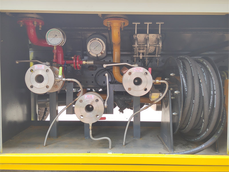 储罐配件:HOWO LPG 加气车配备完整的加气系统,包括泵、流量计、软管卷盘和紧急切断阀,以及必要的安全配件,如液位计、温度计、压力表和安全阀。