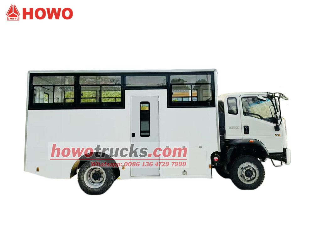 HOWO 4x4全轮驱动运兵车基于HOWO轻型卡车1880排半全轮驱动底盘改装而成,轴距3360mm,搭载潍柴WP3NQ140E50发动机和WLY6G120变速箱。车体为厢式结构,设有两排长座椅,可容纳15名士兵。车身两侧设有长窗,尾门上也设有小窗。车辆右侧设有单扇车门,尾门上设有双扇车门,方便士兵上下车。该车配备空调。