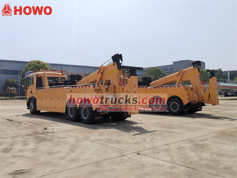 Howo 6x4 拖车配备了强劲的液压支腿系统(单支腿额定起重能力 12.5 吨),提供宽广的支撑跨度,确保重型救援作业的安全性和稳定性。黄色豪华单排半卧铺驾驶室(可选其他颜色)、400 升大容量油箱、24V 电气系统、全套警示灯(警示灯、频闪灯)、工具箱及其他配件,使其成为一款功能全面、性能强劲的大型专业拖车救援设备。