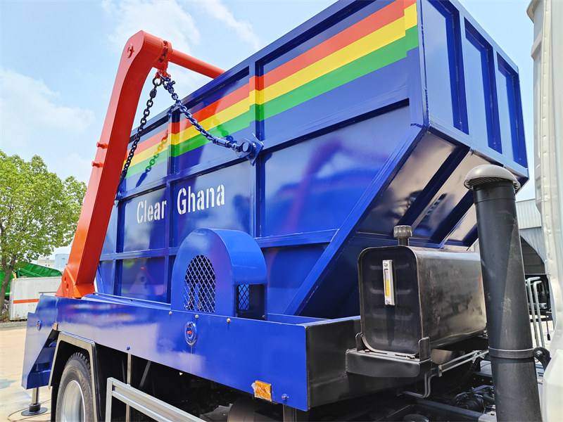 Howo 6x4 滚装式垃圾车配备坚固耐用的8毫米厚平台,并配有强劲的摆臂,用于重型垃圾箱的升降。平台后部设有液压钩,可用于锁定和解锁垃圾箱,从而实现垃圾箱放置在地面上,在固定位置收集垃圾;也可在垃圾站卸货。该车同时配备手动液压控制阀和电控箱,确保操作更加高效便捷。
