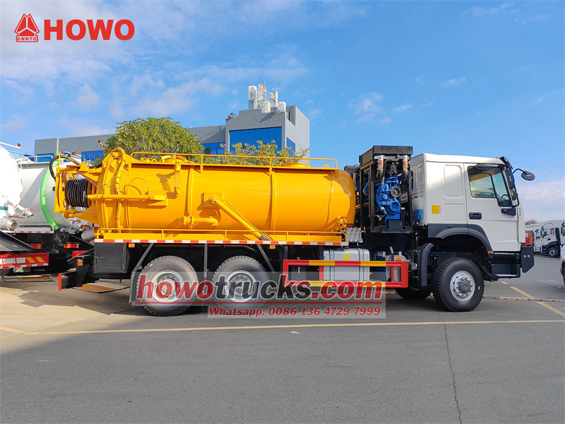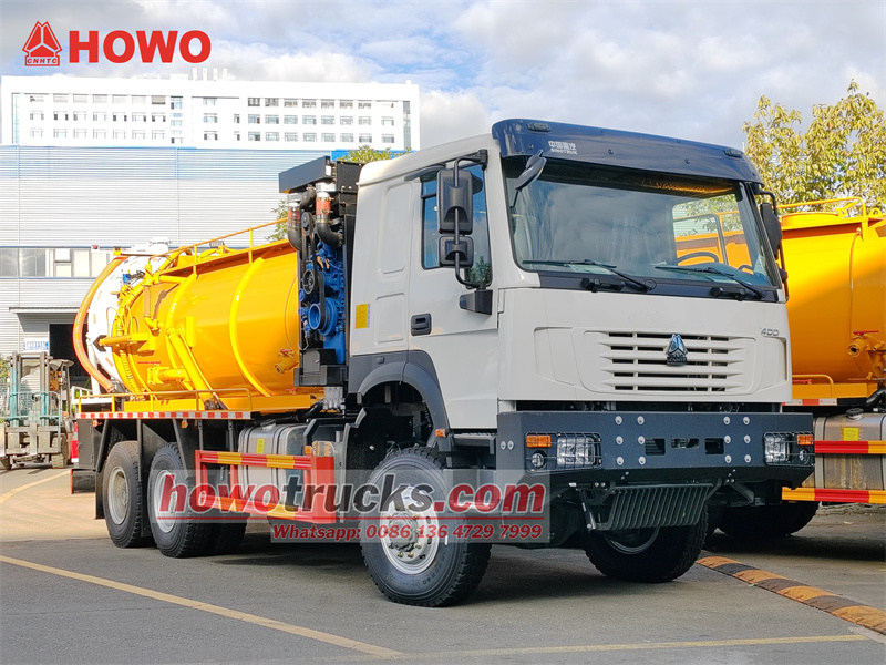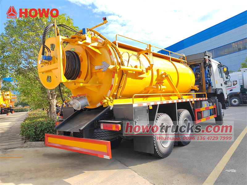 这Howo 6x6 组合式真空喷射车 该设备专为城市管道疏浚、污水清除和高压清洗作业而设计。它配备潍柴400马力发动机和10速变速箱,动力强劲。该车集成10米³ 污水箱和2米³ 清水箱内部设有独立隔间。配备SK-15型水循环真空泵、高压清洗泵和卷盘,可高效完成污水吸排和管道冲洗作业。该车集污水吸排和高压冲洗功能于一体,适用于复杂路况和高强度作业,具备全地形适应能力和高效性能。