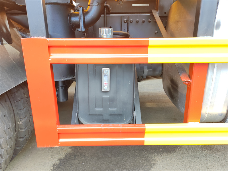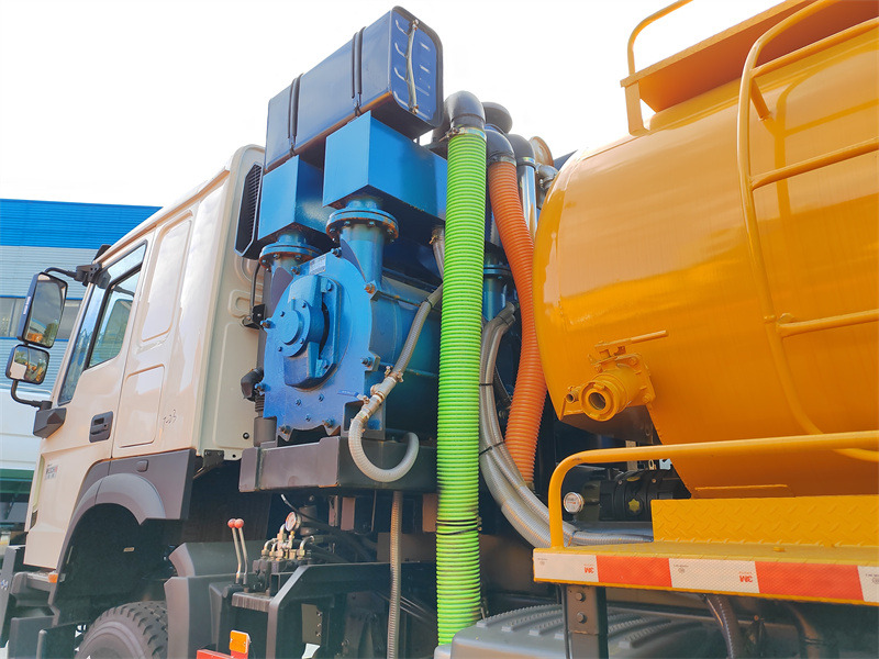 Howo污水吸污车配备有液压油箱、排放阀、SK-15水循环真空泵、污水吸排管、高压清洗泵、高压清洗卷盘、水蒸气分离器、油气分离器、液位观察窗和梯子。