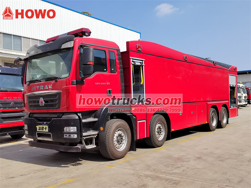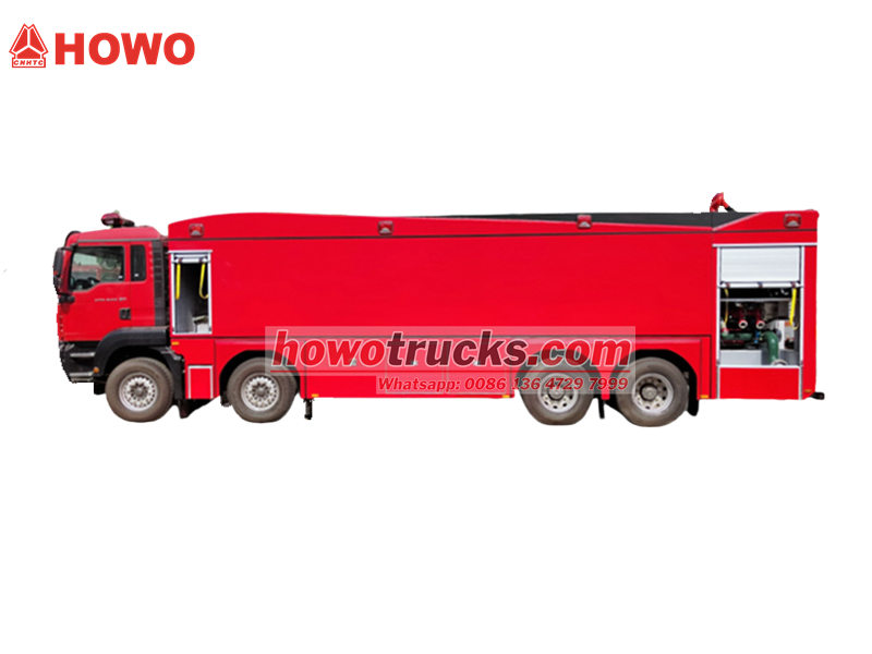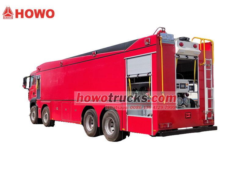 13000*2这 Howo 8x4 消防泡沫泵车 该车采用坚固的豪沃TX 8x4驾驶室底盘,并集成了卓越的动力系统。MC13.54-50发动机拥有540马力,即使超载也能轻松应对各种崎岖路况。它配备了12000升大容量水箱、3000升泡沫液罐以及后置式100升/秒大流量消防泵,喷射距离可达65米。