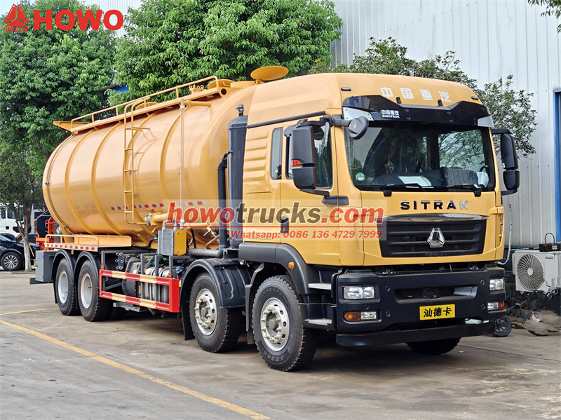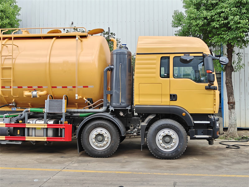 豪沃8x4重型真空吸污车凭借其卓越的性能和多功能设计,已成为行业标杆。该车搭载强劲的潍柴系列发动机,最大功率达350马力,配合高压清洗泵(压力16-19MPa)和吸污系统,可快速疏通下水道、化粪池等复杂场景。其污水罐容积高达20立方米,单次作业即可实现大容量和极高的效率。该车采用模块化设计,可选配前置卷筒、液位计和喷淋装置,以满足多样化的需求。