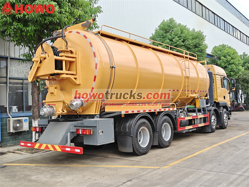18000KG*2在市政卫生领域, Howo 8x4重型清洁真空污水罐车 凭借其卓越的性能和多功能设计,该设备已成为行业标杆。它配备了最大功率达350马力的潍柴系列发动机,结合高压清洗泵(压力16-19MPa)和污水吸污系统,可快速疏通下水道、化粪池等复杂场景。污水箱容积高达20立方米,单次作业即可实现大容量和极高的效率。该设备采用模块化设计,并可选配前置卷筒、液位计和喷淋装置,以满足多样化的需求。