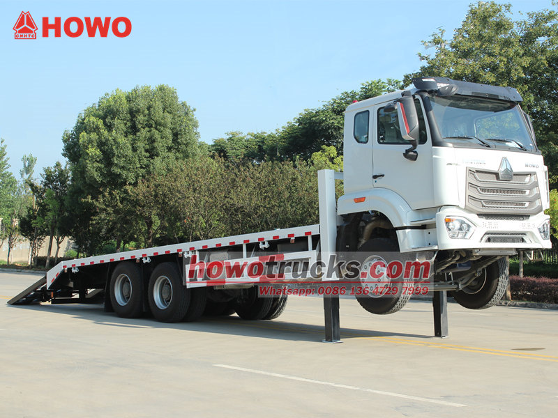 这 HOWO NX 自装式卡车 该车配备专业且强大的功能。车厢采用8毫米厚的防滑花纹钢板制成,尺寸为8600×2500毫米,专为安全运输中型挖掘机及其他设备而设计。车辆后部配备两条2米长的液压坡道,方便机械设备的装卸。此外,前部两个液压支腿,每个支腿的起重能力为20吨,显著提升了在崎岖地形上作业的稳定性。车头还安装了一台4吨液压绞盘,可用于救援或固定设备,全面满足菲律宾用户对多功能性和可靠性的需求。