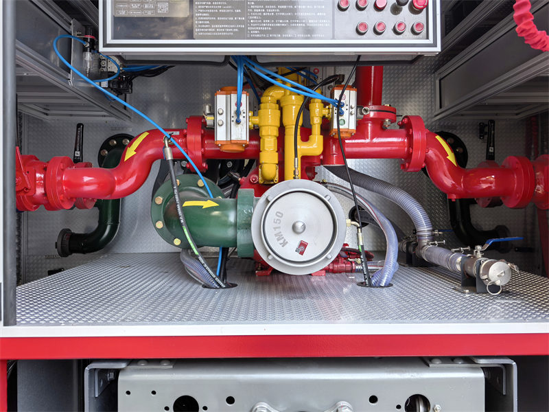 水箱系统: 前部是设备间,存放着各种消防设备(例如消防水带、灭火器、消防斧、扳手、锤子、镐等),方便取用。中间部分设有一个6立方米的碳钢水箱和一个2立方米的泡沫液罐,两者顶部均设有检修孔。