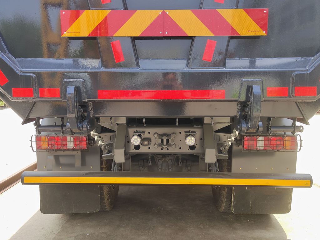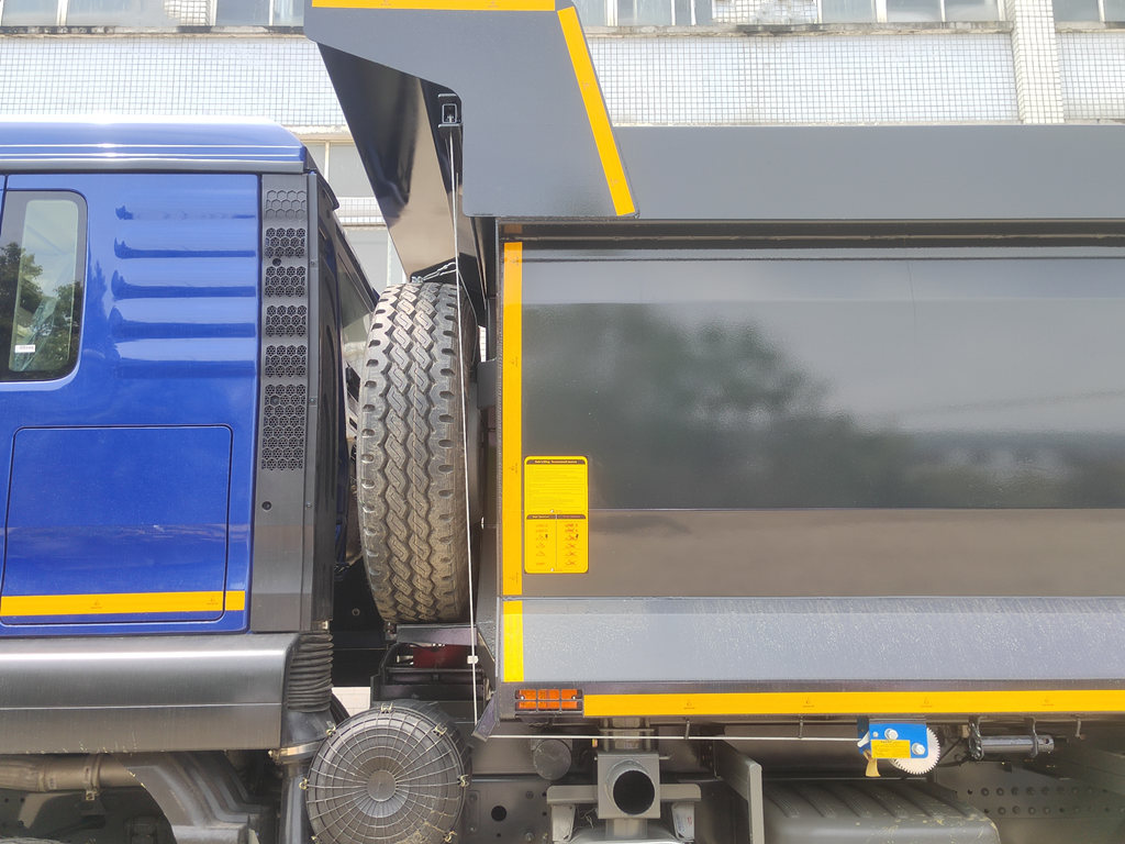 它配备了WP10.380E22 380马力柴油发动机和HW19710变速箱,轴距为3200+1400毫米,是一款坚固耐用、用途广泛的自卸车。车厢设计巧妙,通过液压升降装置,可实现快速自动倾卸货物,无论是沙子、煤炭还是泥土,都能高效卸载,大大节省人力和时间。