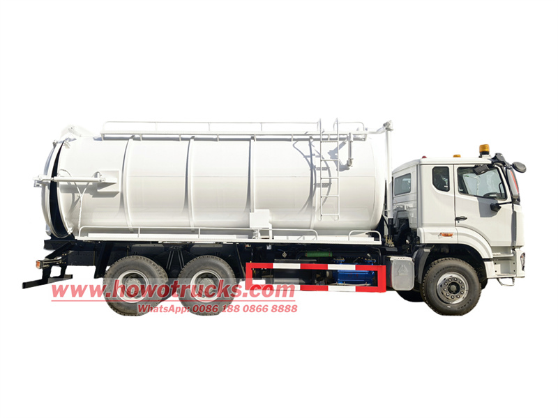 16000*2This Nigeria HOWO NX septic tanker cleaning truck is a specialized vehicle designed for Nigeria heavy-duty sewage suction operations. Based on the Sinotruk HOWO NX400 chassis, it integrates a 20 cubic meter sewage suction tank and a 2BE-204 water circulation vacuum pump, enabling efficient sewage suction. This truck features self-priming and self-discharging capabilities, a large capacity, convenient transportation, and a powerful vacuum pump with a long suction range, making it suitable for heavy-duty operations such as urban pipe network dredging and septic tank cleaning.