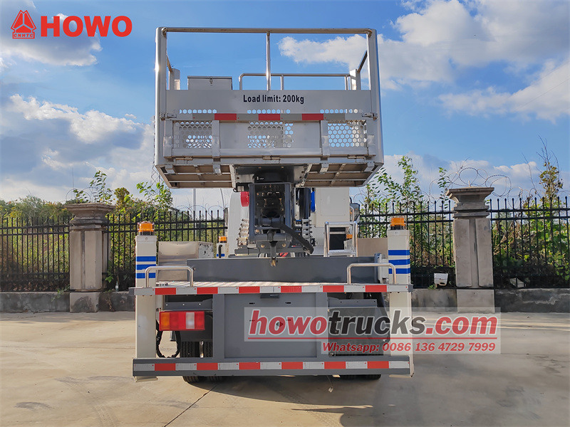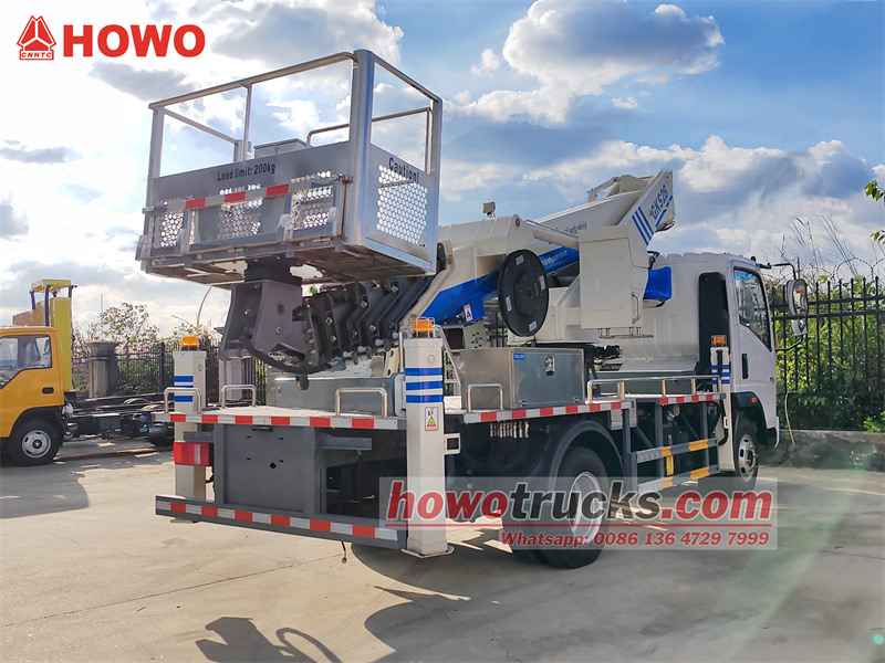 这款中国重汽右舵高空作业平台车采用豪沃右舵轻型卡车底盘,轴距4500mm。它搭载潍柴WP2.3Q140E62发动机和WLY6TS55变速箱。上部配备六节伸缩臂,可通过地面和转盘进行操作。控制盒或通过遥控器控制。它可以360度旋转。 该设备具有一定角度,配备四个液压支腿,最大铲斗负载能力为200公斤,采用铝合金面板和防滑纹理走道。此外,它还配备了夜间作业灯。